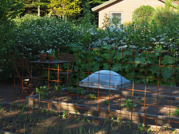 Jeg elsker denne her tid på året, hvor alting spirer (selvom ukrudtet godt måtte holde lidt igen). Det ser så pænt ud i højbedene, inden planterne bliver for store. Det passer min perfektionisme, når alting står i pæne lige rækker og ikke vælter ind i hinanden. Synes det ser så godt ud med den blomstrende hæk og de store rabarber i baggrunden. Hækken er nærmest endnu vildere i år, så fantastisk fin – og den dufter. Synd det ikke holder så længe.