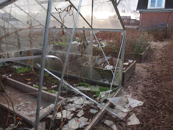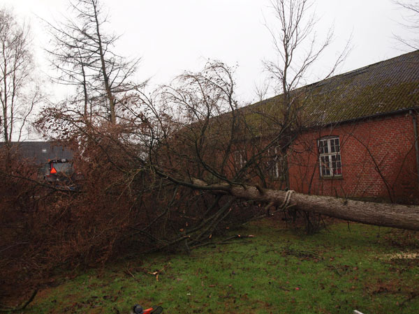 Stormen i sidste uge lavede lidt ommøblering i haven. Drivhuset er i en sølle forfatning, så jeg er desværre nødt til at have et nyt – ØV. “Bodil” lagde også et af de store lærketræer ned og halvdelen af et andet. Derfor måtte motorsaven i gang. Lørdag fik Morten hjælp af nogle “gæve gutter”, så nu er der frit udsyn til det knapt så pæne forsamlingshus, for alle de store træer er væk.