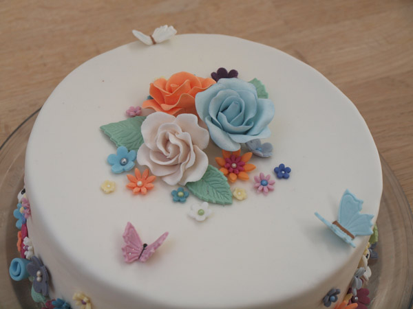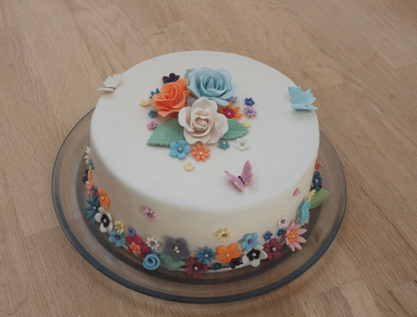 I går var jeg i Hundslund for at være lidt kreativ med glas. Jeg havde lovet at bage en kage, så det var en god anledning til at prøve at pakke en gulerodskage med oste-smør creme ind i fondant. Desuden var det en god anledning til at få brugt alle mine blomster-rester, så alt i alt var det egentlig en ret nem kage.
