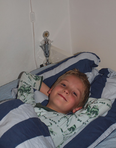 Sådan ser det ud, når Danmarks 2. bedste U8 spiller lægger sig til at sove – MED sin pokal :-).