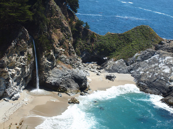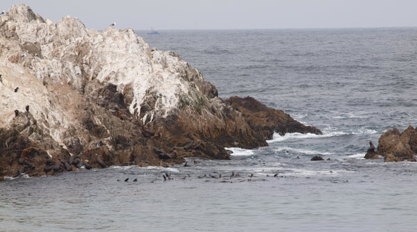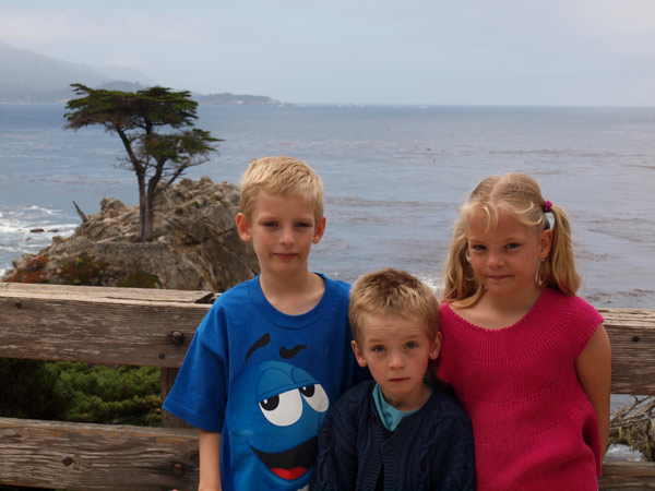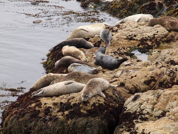 Inden vi kørte sydpå, tog vi en tur rundt på det, der hedder 17 mile drive. Det er en tur, der går ind gennem et flot “rigt” kvarter i Monterey. Man betaler selvfølgelig for at køre ind, men så er der også en fin tur rundt mellem kæmpe villaer/sommerhuse og lige ned til kysten. For de golf interesserede i familien kan vi sige, at det var nogle fine baner med huller helt ud til Stillehavet (men man skal vist også betale en pæn sum, for at få lov til at forlyste sig her). Man kan gøre flere stop på turen. Der var bl.a. en klippe, der var fuld af søløver. Det tog lige lidt tid, før vi fik øje på dem (vi kunne tydeligt høre deres gøen), på billedet kan I se dem lige under det hvide på klippen og hovederne ude i vandet. Der var nok 100 søløver, der hyggede sig og legede i vandet. Det så så sødt ud, de hoppede ned i bølgerne. Lidt efter kom vi til et sted, hvor de kæreste sæler lå lige nedenfor på stranden og klipperne. På denne tur er der også et berømt træ kaldet “The Lone Cypres”. Det står helt alene på en rå klippe – et flot syn.