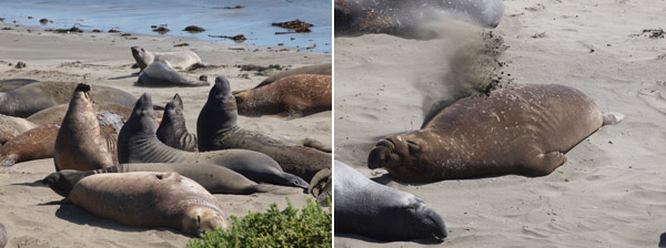 Lidt senere kom vi endnu engang forbi nogle dejlige dyr – der var en strand helt fuld af søelefanter (det tror jeg i hvert fald det var – her kalder de dem elefant-sæler). De ligner også kæmpe sæler med store næser. De store hanner lignede lidt “forlæns og baglæns” fra Bamses Billedbog i gamle dage. De lå og kastede sand på ryggen og sloges lidt med hinanden. De har været lige ved at uddø, men nu er bestanden voksende igen. Der var rigtig mange på stranden.