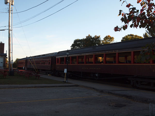 På vejen mod Conway var vi inde i en kæmpe patchwork/quilte butik og en fin strikke butik. Vi nåede også lige forbi endnu et outlet, inden vi klokken 16.30 tog en tur med North Conway scenic railroad – en times tur med et gammelt damplokomotiv. Vi havde vist taget lidt fejl af, hvad turen gik ud på, for vi havde troet, det var sådan en tur, hvor vi kom ud og så en masse fine træer og udsigter her i White Mountains, men det var vist selve turen med det gamle tog, det gik ud på. Det var hyggeligt nok, men nok ikke det, vi ville have valgt, hvis vi vidste det.