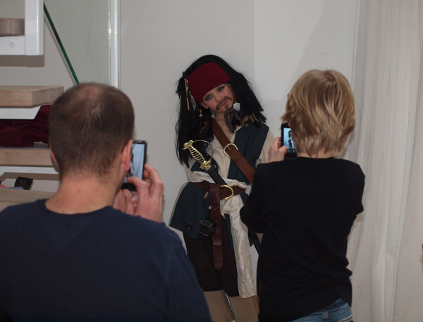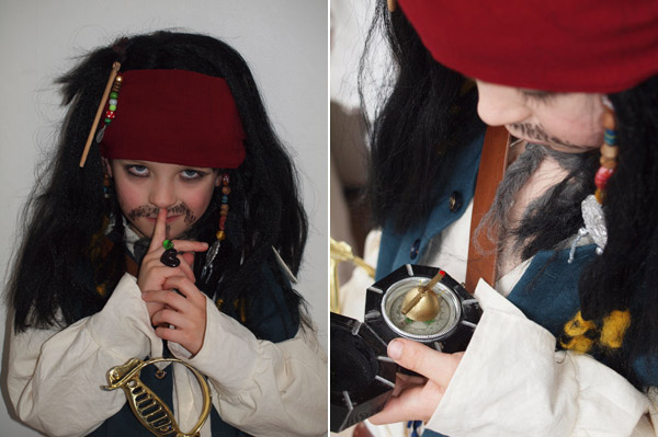 Marius havde fået morfar til at lave et kompas som i filmen, og der er sat perler i håret med næsten de rigtige farver, vesten måtte lige laves lidt om, for den var først blevet blå på ryggen også – men det er den rigtige altså ikke, konstaterede Marius. Men nu i dag kunne han så prøve det hele (næsten originale…) tøj. Han var så fin og lever sig rigtig ind i rollen som feteret og lidt fordrukken kaptajn…