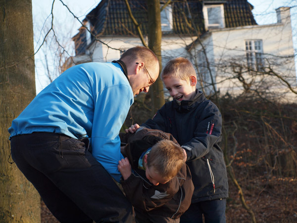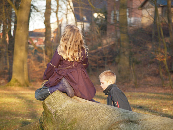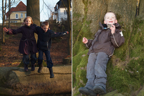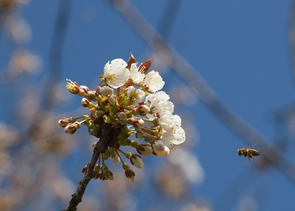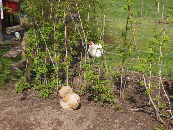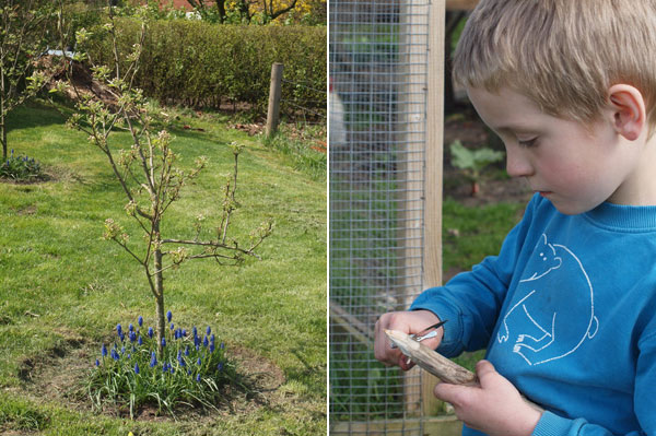 Kirsebærtræet er netop sprunget ud, Marius har vandet have (så er det forår), og hønsene har taget støvbad.