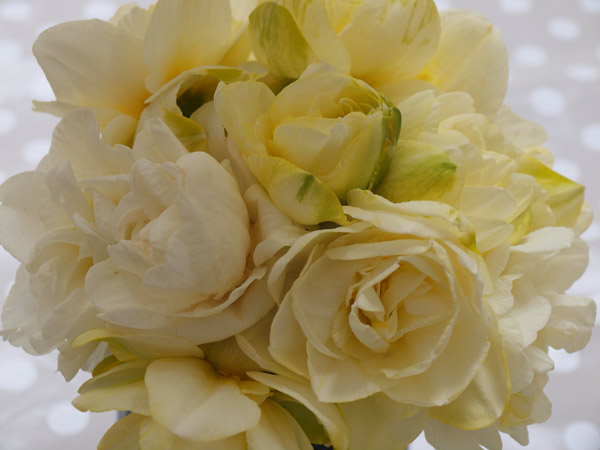 Jeg har de yndigste dobbelte påskeliljer, jeg lagde forrige år, så det er første år, jeg ser dem i blomst. Var jo i USA sidste år, da de blomstede. Desværre er de så tunge i hovederne, så de knækker – men som buketter er de jo heller ikke værst.