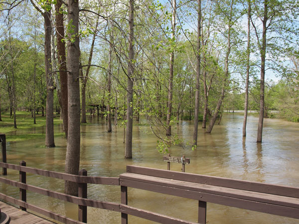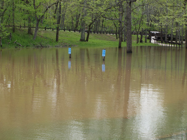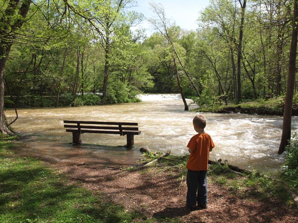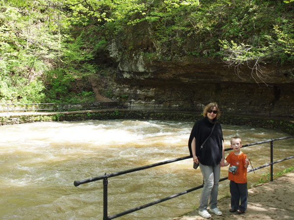 Klokken 13.30 tog Morten tvillingerne til Sport and Games, mens vi andre tre benyttede os af en solstråle og tog i Maramec Spring Park. Jeg havde sådan glædet mig til at vise Stina fiskene, man kunne håndfodre – men det var helt andreledes end sidst, vi var der. Al den regn/skybrud vi har haft den sidste uge, havde lavet en hel oversvømmelse derude. Vandstanden var meget høj, noget af parkeringspladsen var under vand, der løb voldsomt med vand i vandfaldene, og vandet var helt brunt af mudder, så der var slet ingen fisk – øv. Der hvor vandet kommer op, og hvor vi sidst kunne se lidt krusninger, var der et helt lille springvand. Her er nogle billeder derfra – I kan jo sammenligne med dem fra sidst den 9. april. Alligevel er det jo et flot sted.