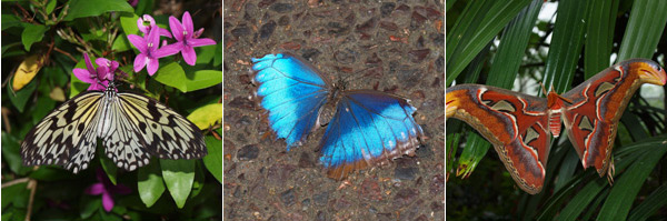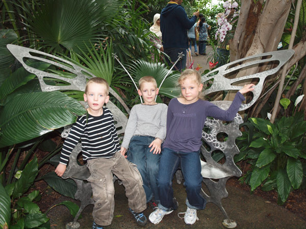 Vi delte os herefter, for vi var kørt i 2 biler. Vores lille familie tog en tur i sommefuglehus. Her var rigtig fint med mange forskellige flotte sommerfugle inde i et slags drivhus. Der var også en fin udendørs have, men den var jo også helt våd.