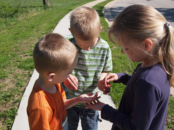I går havde vi en rolig dag – tror ungerne trængte til det efter alle oplevelserne i tirsdags. Det må da også være lidt hårdt med alle de indtryk og så al den snak, man slet ikke forstår noget af. Men de tager det nu fint og vil gerne lære. Efter skole var vi ude at gå en lille tur i det dejlige vejr. Her studerer de en sommerfuglelarve, vi fandt på vejen.