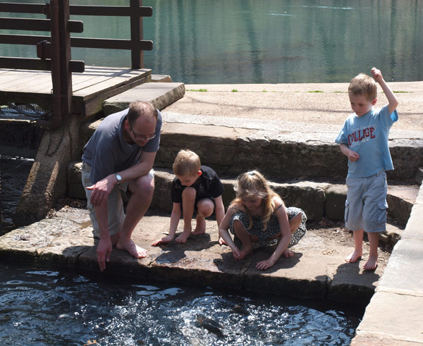 Herefter tog vi en tur ud til Maramec Spring park, der er et virkelig smukt sted tæt herved. Det er et kendt sted for alle fiskerne her omkring, og de stod også hele vejen langs åen for at fange regnbue ørreder. Det er dog lidt ligesom put and take, for fiskene bliver opdrættet lidt længere oppe i nogle små “søer” og så lukket videre ud i åen. Man kunne fodre fiskene, der skulle opdrættes. Det var faktisk ret sjovt. De var helt vilde og nærmest hoppede op for at få mad. Man kunne stikke hånden ned og røre dem.