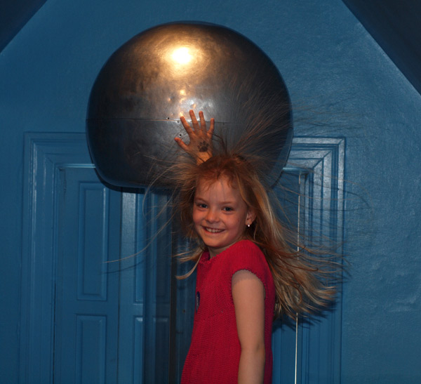 Der var også en “Van de Graff  – generator” – en “kugle”, man kan røre ved og så få helt elektrisk hår. Desværre var Marius for lille til at nå den, Jeppes hår var meget kort men på Signe, virkede den perfekt.